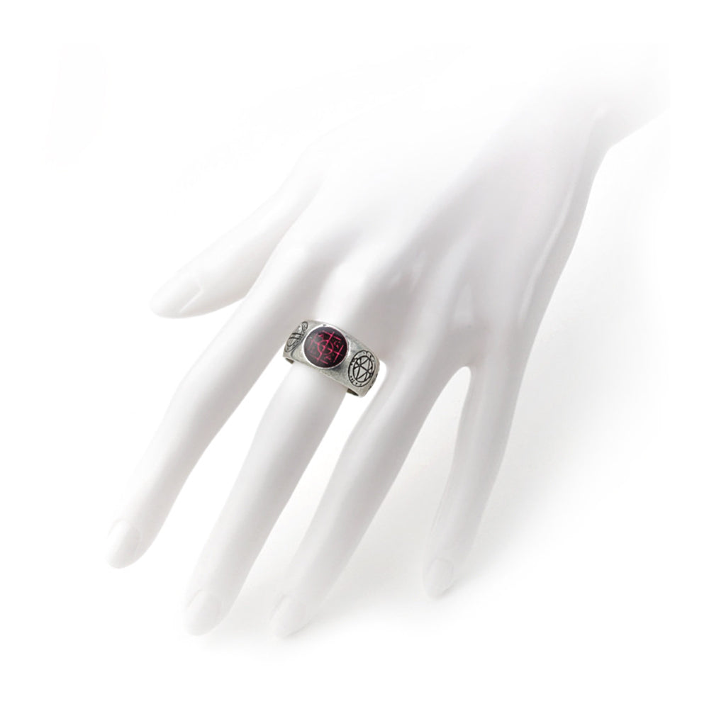 A pewter band ring engraved with magical talismans, with the central one beneath a translucent purple enamel.