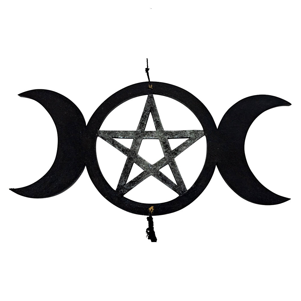 The triple moon symbol with Pentacle, also called the triple Goddess symbol, is represented by two crescent moons flanking a full moon. The left side of the symbol features a waxing moon, the center features a full moon, while the right side depicts a waning moon. The symbol is a representation of the changing phases of the moon which also correspond with the stages of womanhood. It can also symbolize the endless cycle of birth, life, death and rebirth. 22" x 7.5"