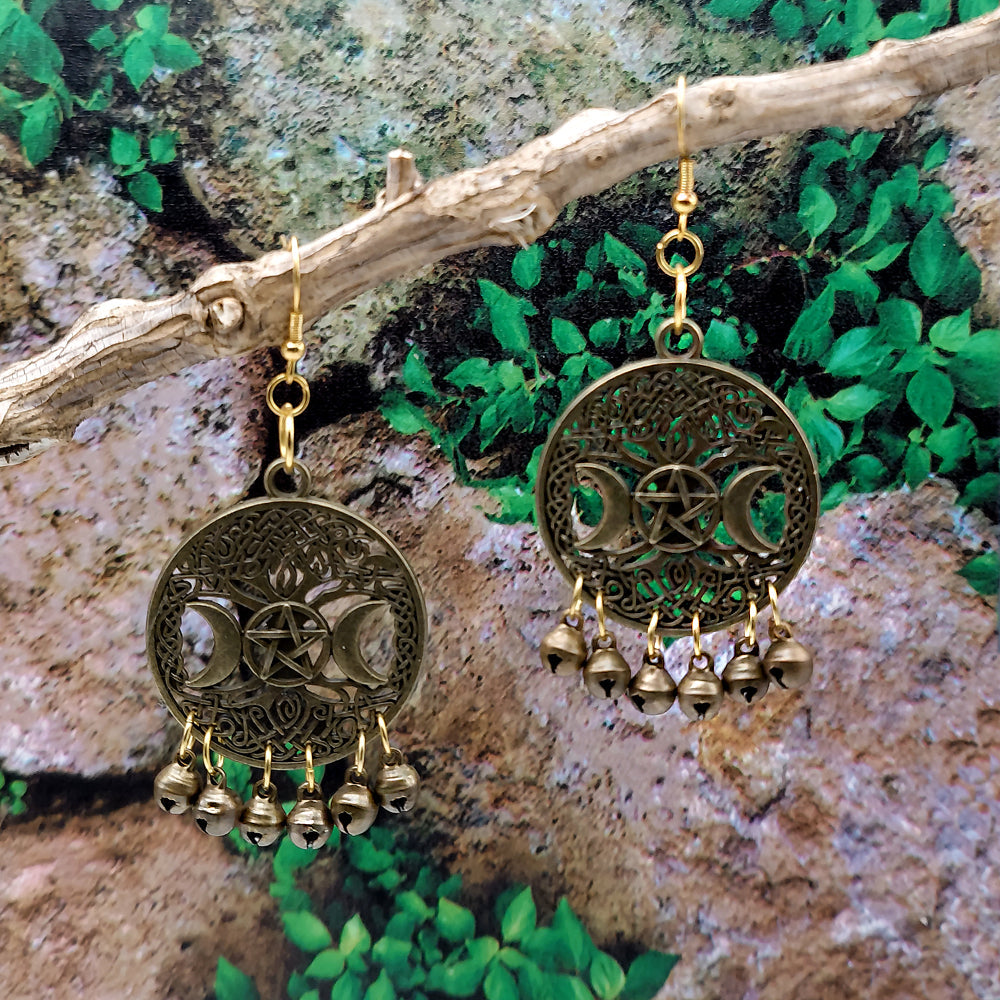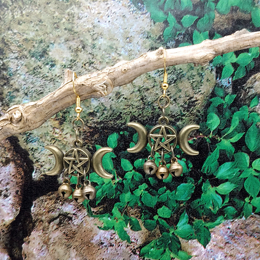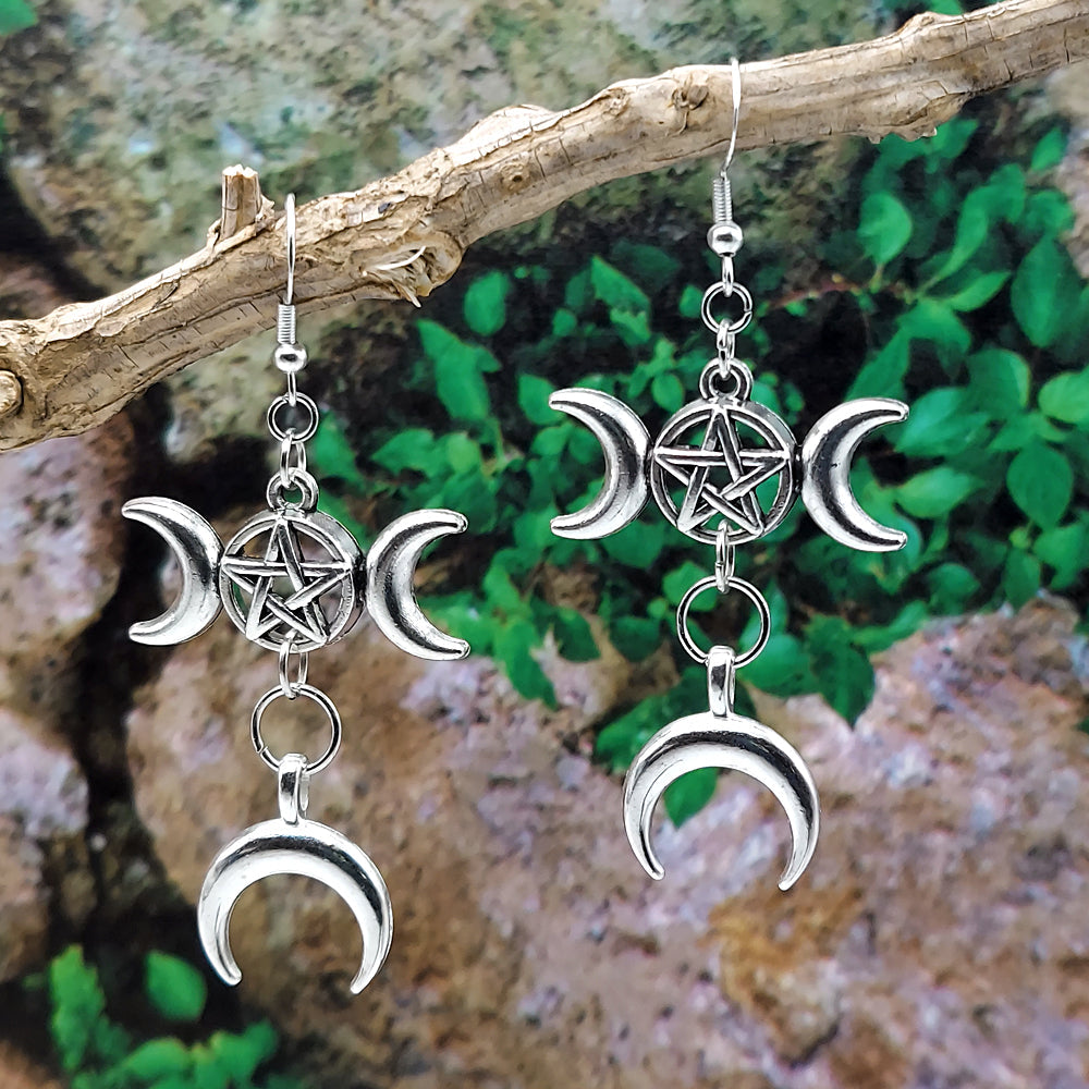 Let your charming side show with these lovely pentacle themed earrings! Handcrafted and designed, these earrings are perfect for that special someone (especially if it’s yourself!) who walks the path of the pentacle. Made from metal. Assorted Styles. Ear pieces are labeled hypoallergenic but allergen safety cannot be guaranteed. Stop wear if itchiness or pain occurs. If needed, custom orders can be made with acrylic earring pieces at no extra cost. 3 3/8" x 1 7/8"