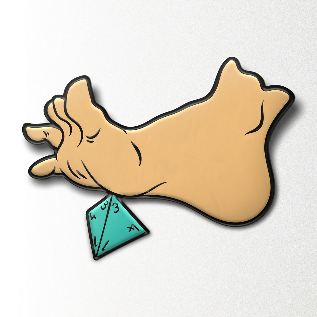 Every adventurer knows the real danger isn't the dragon—it's stepping on a stray D4! The D4 Foot Enamel Pin humorously captures that iconic moment of sharp pain with a design featuring a foot stepping on a teal-colored D4. It's the perfect pin for RPG players who live (and limp) through tabletop adventures.