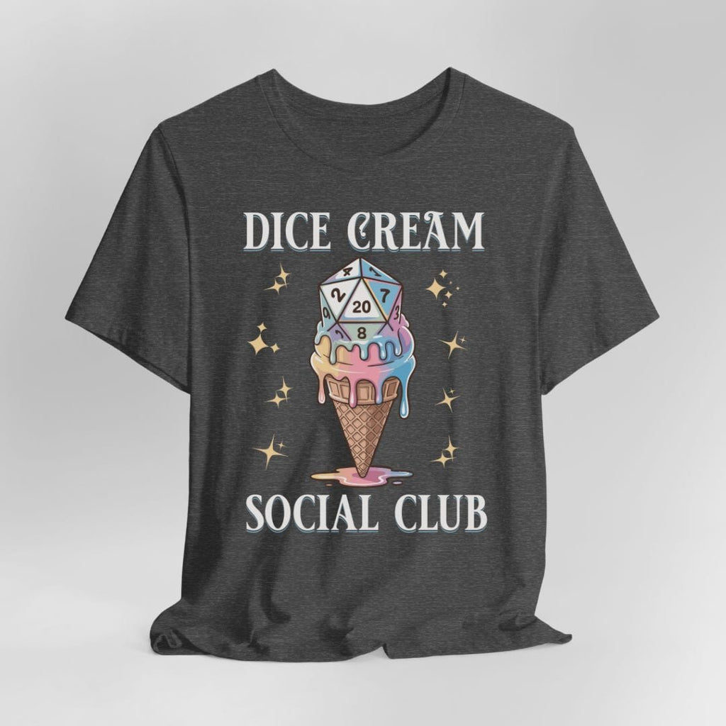 Introducing the sweetest D&D-inspired tee you’ll ever wear—Dice Cream Social Club! This playful design features a pastel d20 dice scoop melting over a waffle cone, complete with shimmering stars and vintage-style text. Whether you’re a dice goblin, critical hit connoisseur, or just a fan of tabletop treats, this shirt is perfect for game nights, summer sessions, or showing off your love for all things nerdy and nostalgic. Great gift for D&D players, dungeon masters, and anyone who thinks ice cream and imagination are the ultimate combo.