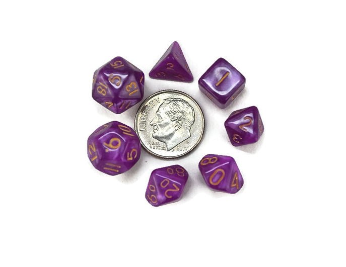 Set of seven polyhedral 10mm mini dice. Mini Light Purple Dice Set. Comes in plastic tube container.