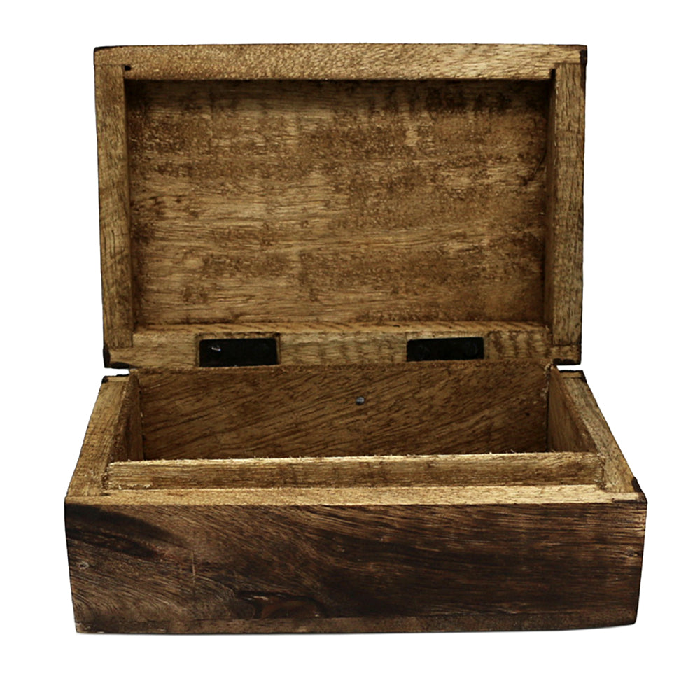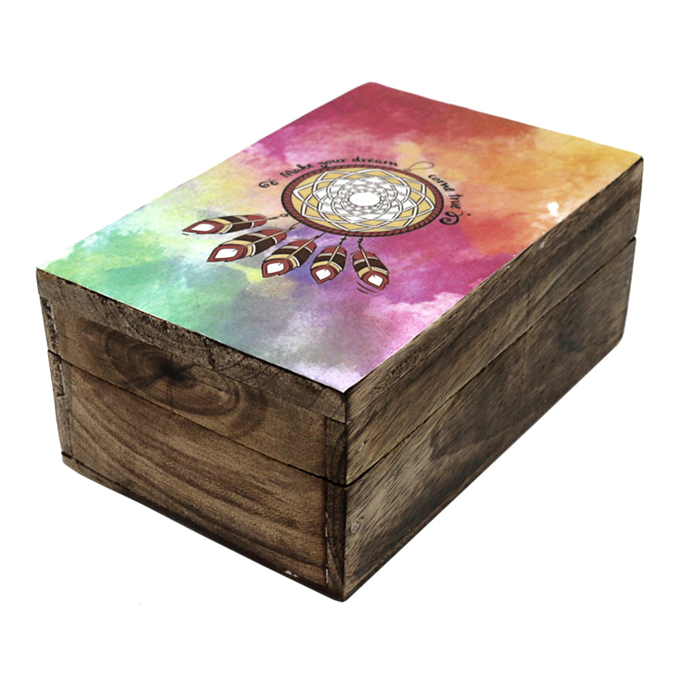Dreamcatcher Wooden Box 6" x 4" x 2.5". Wonderfully detailed printed top of a Dreamcatcher with the words "Make your dream come true", with light stained wood. Use as storage for crystals, jewelry, cards, herb, oils etc. A standard 3 x 5 tarot deck easily fits into the box, (unboxed).