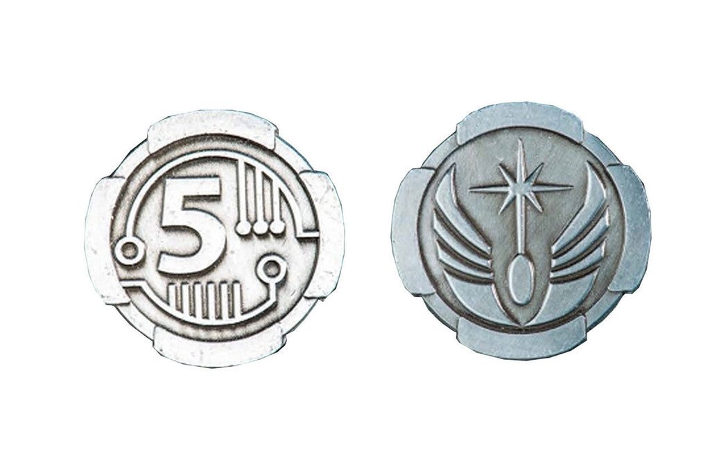The Sci-Fi 5 Credit coins are circle shaped and have an lightly aged silver finish.