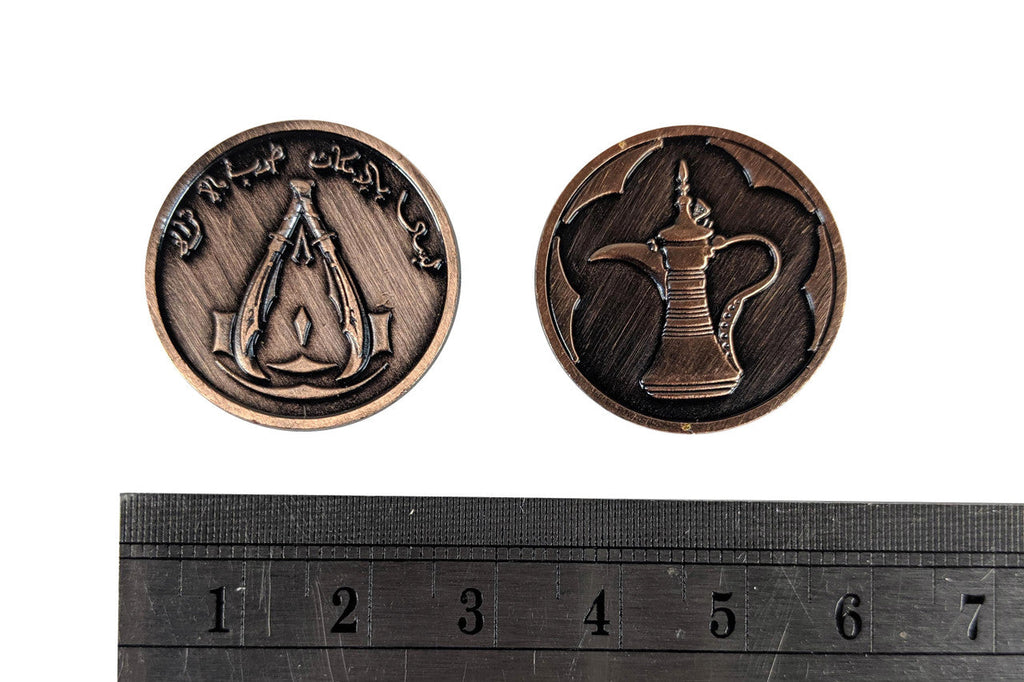 These heavy-weight, finely-minted coins are crafted from zinc and nickel with high-relief 3D detailing and a hand-buffed finish.