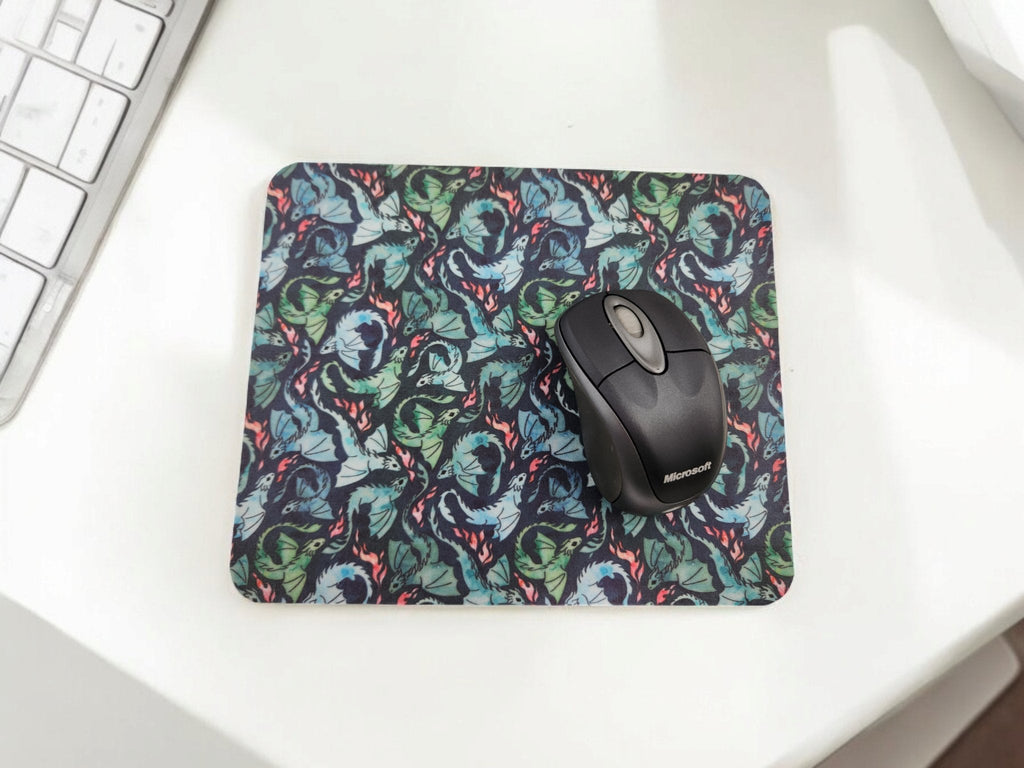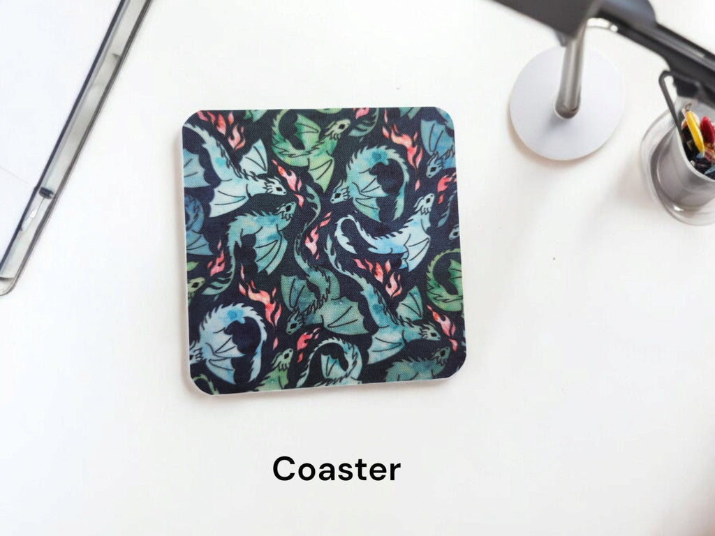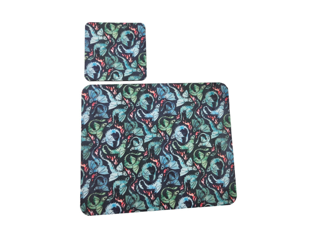 Flying dragons desk set. Add a personal touch to your desk with this fabric top mousepad and coaster.