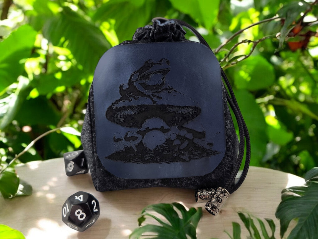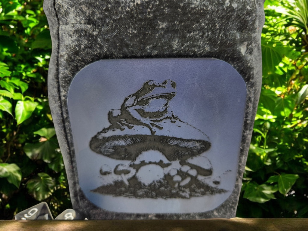 * Attached on the outside of the dice pouch is a faux leather engraved with a frog and mushroom design.