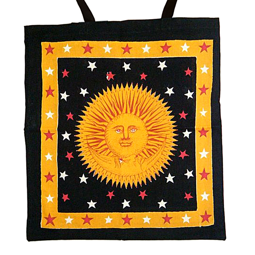 This 100% cotton tote bag is perfect for everyday uses! It has a beautiful Golden Sun & Moon surrounded with stars on the front and back in multi colors! Its very vibrant and beautiful! Use this tote to carry books, groceries, yoga clothes, and more! It's 18x18 Inches square plus straps. You will receive one similar to the photos as each are slightly different due to the nature of the printing.