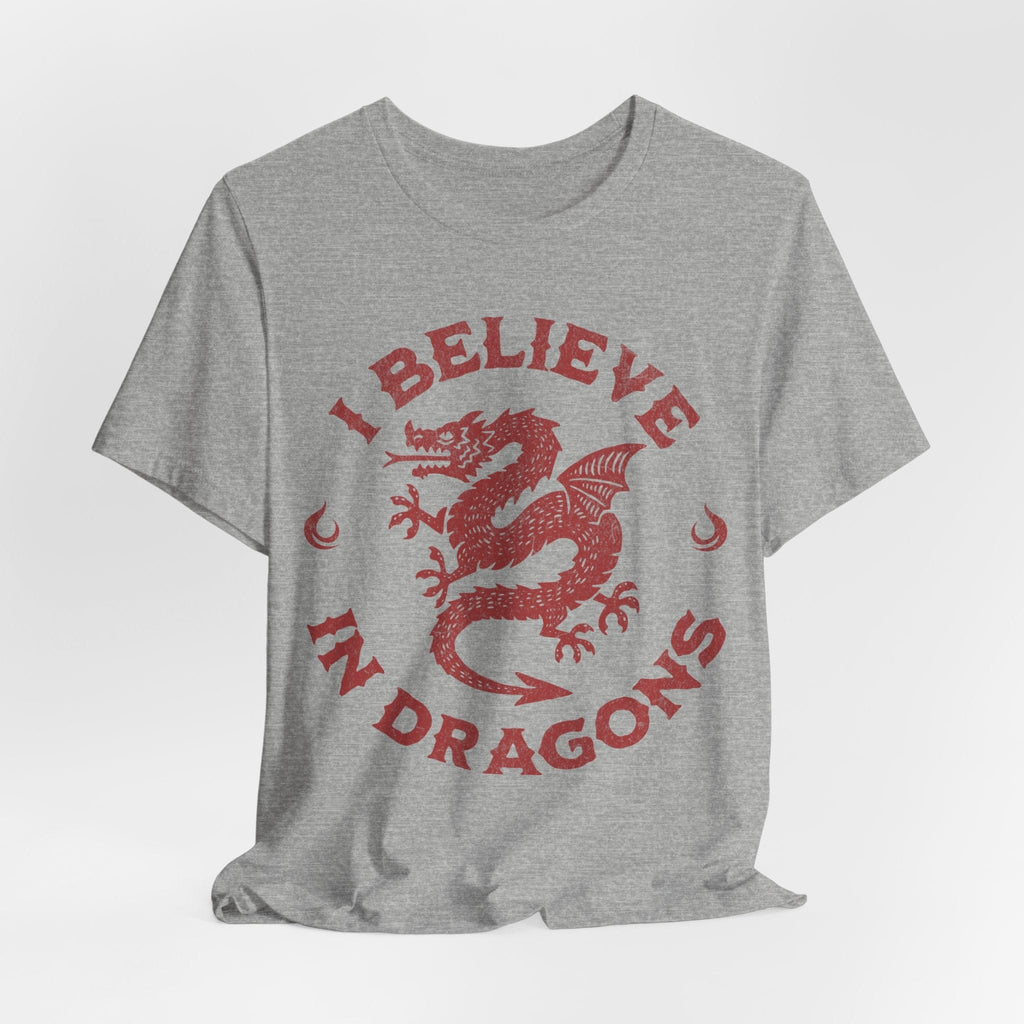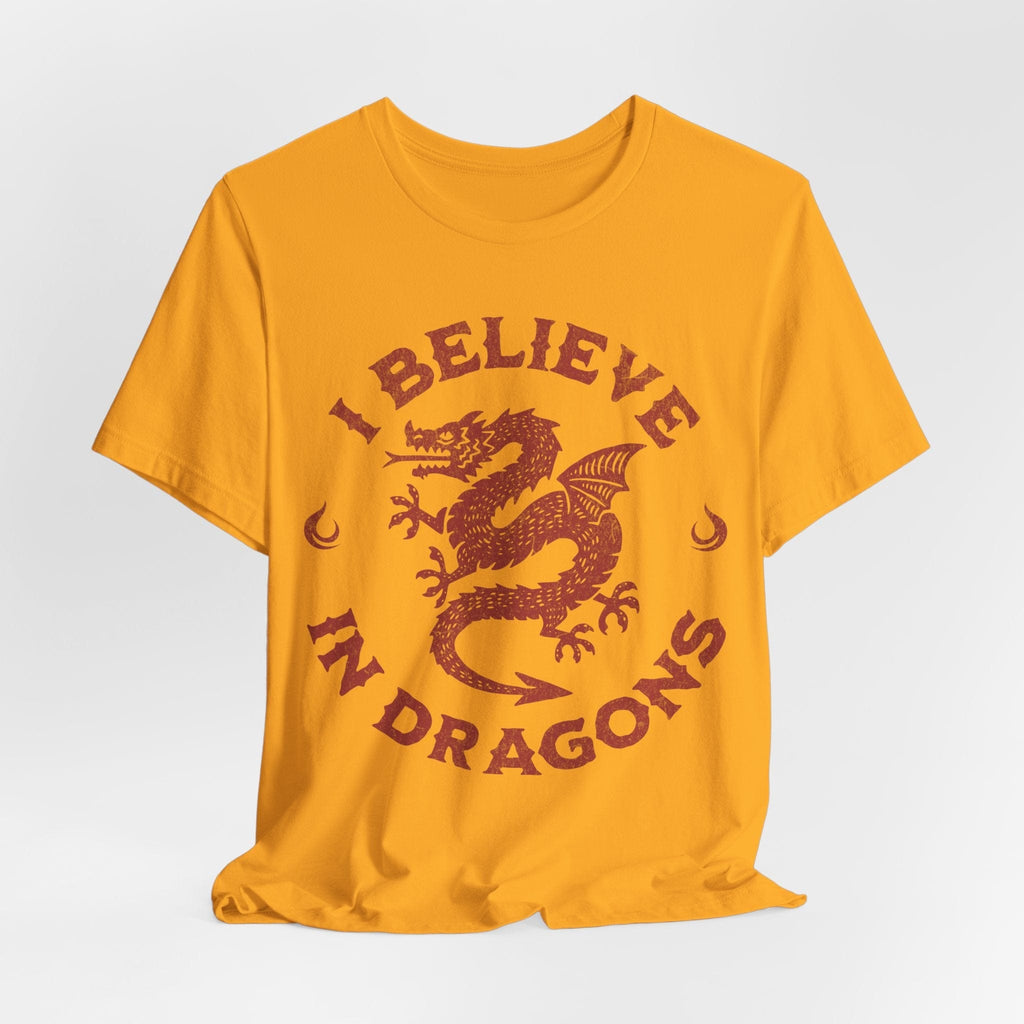 Declare your allegiance to the mythical with our bold and fiery “I Believe in Dragons” tee. Featuring a vintage-style dragon graphic in bold colors, this design is perfect for dreamers, lore-lovers, and anyone who suspects there's a little magic still left in the world. Whether you're wandering enchanted forests or just your local coffee shop, this soft and comfy tee lets you wear your fantasy pride loud and proud. Because let’s be honest—who wouldn’t believe in dragons?