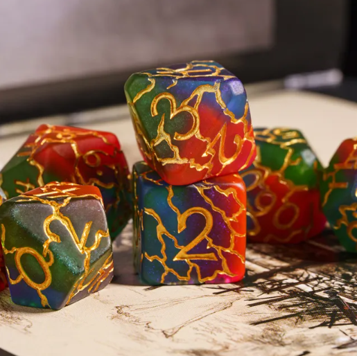 - Color Palette: Each die in the set boasts a translucent base in one of four colors: vibrant red, lush green, deep blue, or regal purple (purple is more muted than rest). This variety allows for a delightful play of light and color, reminiscent of a mystical aurora.