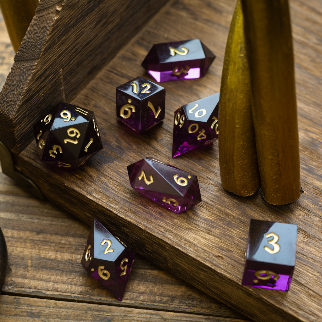 Descend into arcane realms with the Mystic Violet Resin Dice Set, a gleaming collection forged for adventurers who tread the line between light and shadow. Each die is hand-polished to a smooth finish, shimmering with rich violet hues and accented with crisp gold numbering that glows with arcane elegance. Whether striking a deal with a mysterious patron or unleashing eldritch fury, this set transforms every roll into a moment of magic.