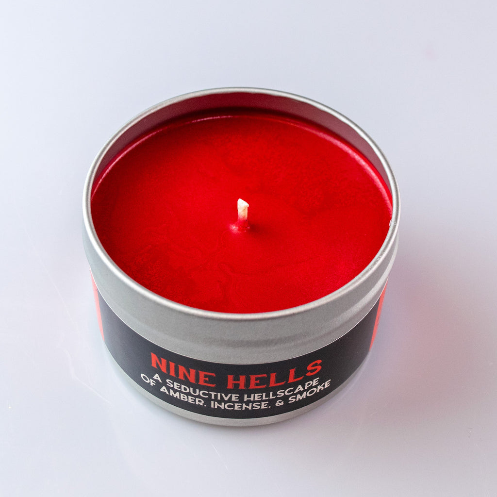 - An 8oz tin, with a colorful label, red-colored wax, and a single wick.