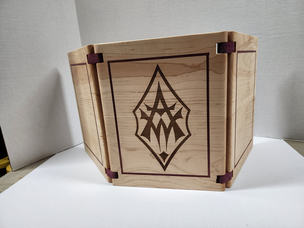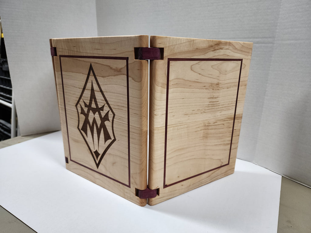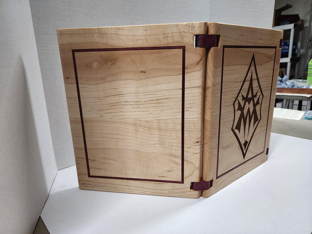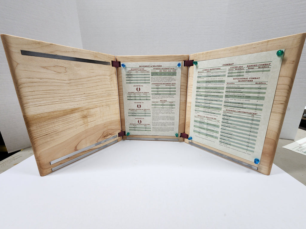 Product Description: Introducing our Solid Hardwood GM Screen, a perfect blend of craftsmanship and functionality. Crafted with care, this screen features a contrasting hardwood inlay on the front, elevating your tabletop gaming experience.