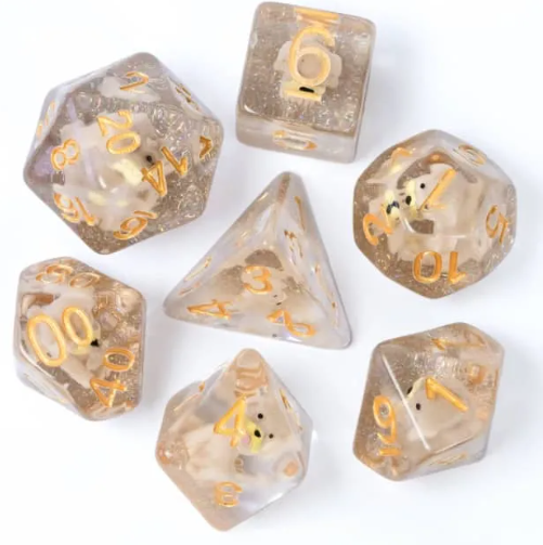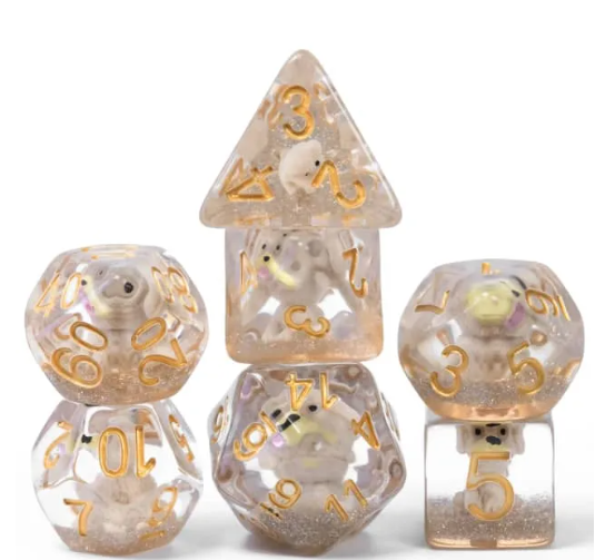 - Great new dice set by UDixi. This set features a clear resin with a tiny puppy inside! Sunk into the resin, these pups have good visibility and sit on a small layer (or bed) of glitter.