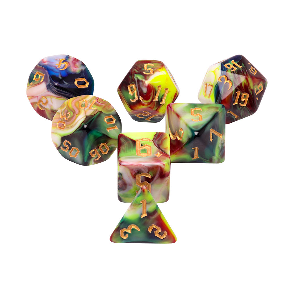 - Brand new, high-quality multi-colored green and gold DnD dice