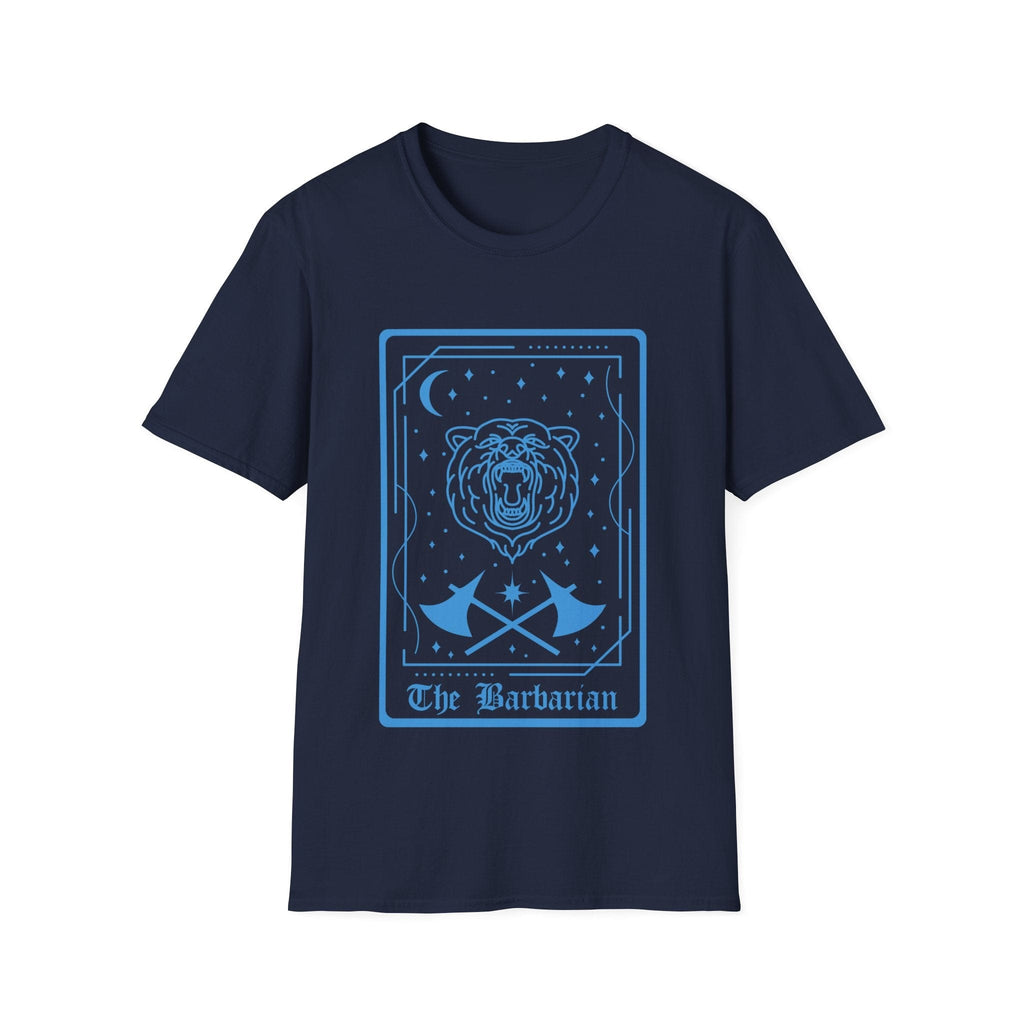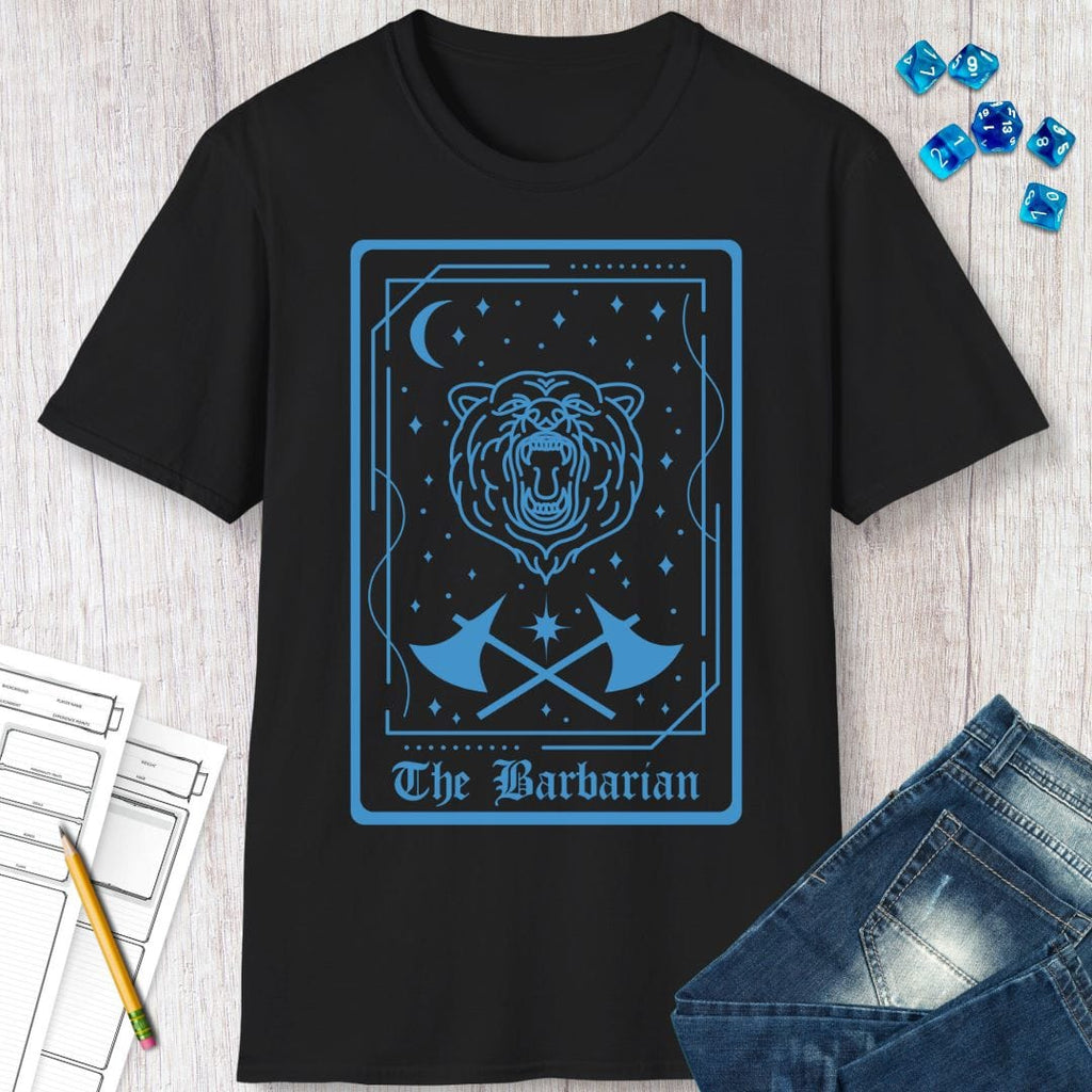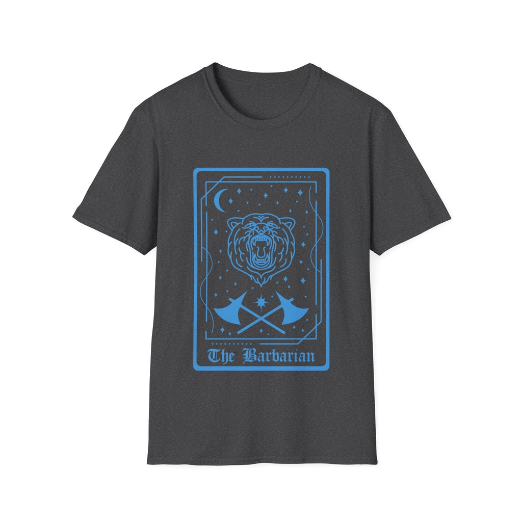 Channel your inner warrior with 'The Barbarian' tarot card t-shirt! This rugged design embodies the raw strength and fearless spirit of the barbarian class in Dungeons & Dragons, perfect for those who lead their campaigns with courage and ferocity.