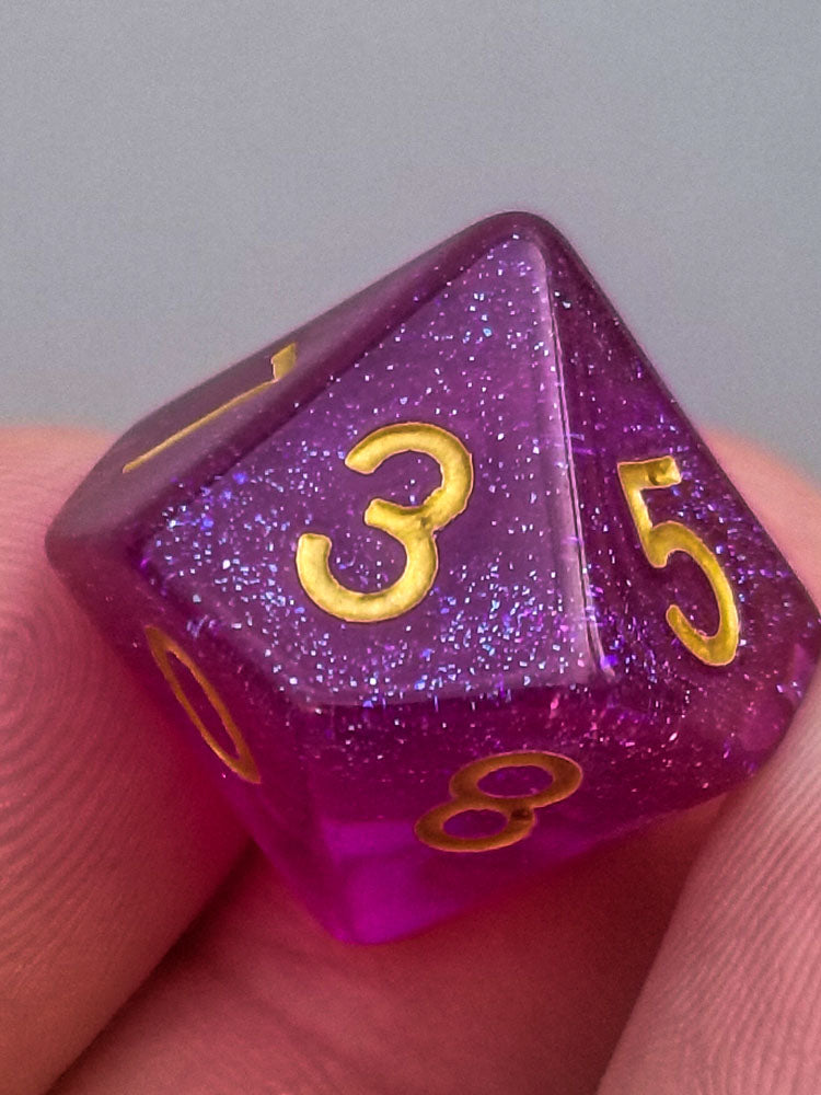 - Features include clear purple resin with glitter powder inside and gold inking.