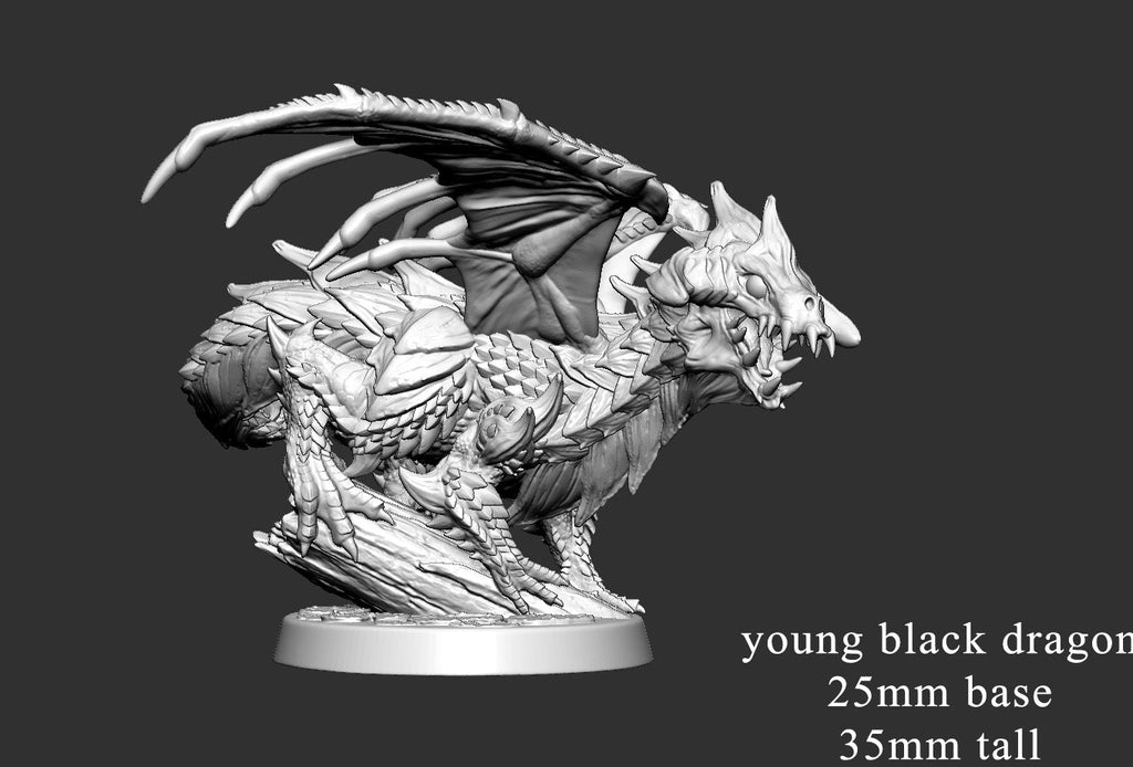 Enhance your tabletop RPG adventures with the Young Black Dragon miniature. Perfect for Dungeons & Dragons or Pathfinder, this detailed figure features intricate scales, dynamic wing poses, and ferocious stances, making it ideal for immersive encounters in your campaigns.