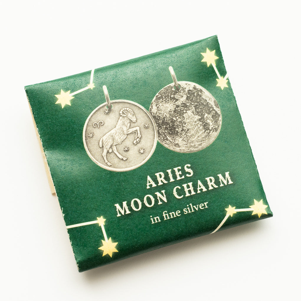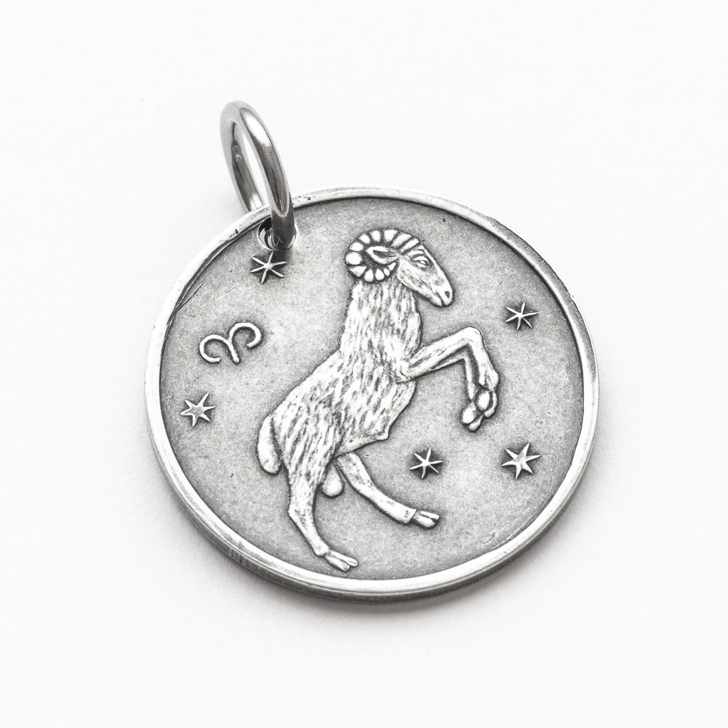 This Aries Silver Moon features a ram surrounded by stars and the Aries symbol ♈