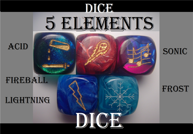 Set of 5 Elements d6s. Features Fireball graphic on "6" side.