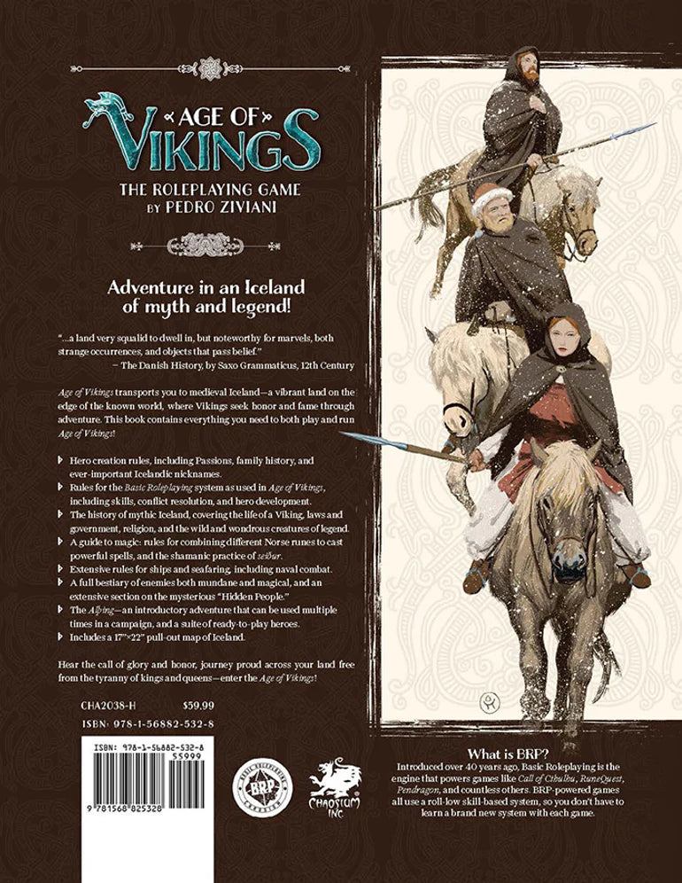 Age of Vikings is a standalone game built with Chaosium’s Basic Roleplaying: Universal Game Engine. This rulebook contains the Hero creation rules, including Passions, family history, and ever-important Icelandic nicknames. The book also has rules for the Basic Roleplaying system as used in Age of Vikings, including skills, conflict resolution, and hero development.
