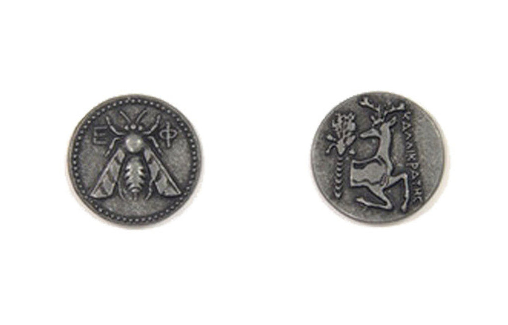 Inspired by the Ancient Greek tetradrachm coins of Ephesos, home of the legendary Temple of Artemis. These coins feature a bee on one side and a stag facing a palm tree on the other. The artwork used is a tribute to the Goddess Artemis.