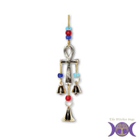 Hanging from a its own chain, this wind chime displays a smooth brass toned Ankh. Hanging from its points are three brass bells hanging beneath. Ankh is 3" x 1 1/4" overall length 10". This magical piece will add color and movement to any altar or space. Bead color may very.