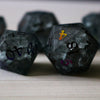 Prepare to be captivated by our stunning Black Inked Lightning Glass Dice Set, accompanied by a mysterious and finely crafted pleather box. Each die is a work of art, an embodiment of thunderous energy and mystique. The electrifying black glass, intricately inked with lightning, holds the power to spark thrilling adventures and mesmerizing tales with every roll.