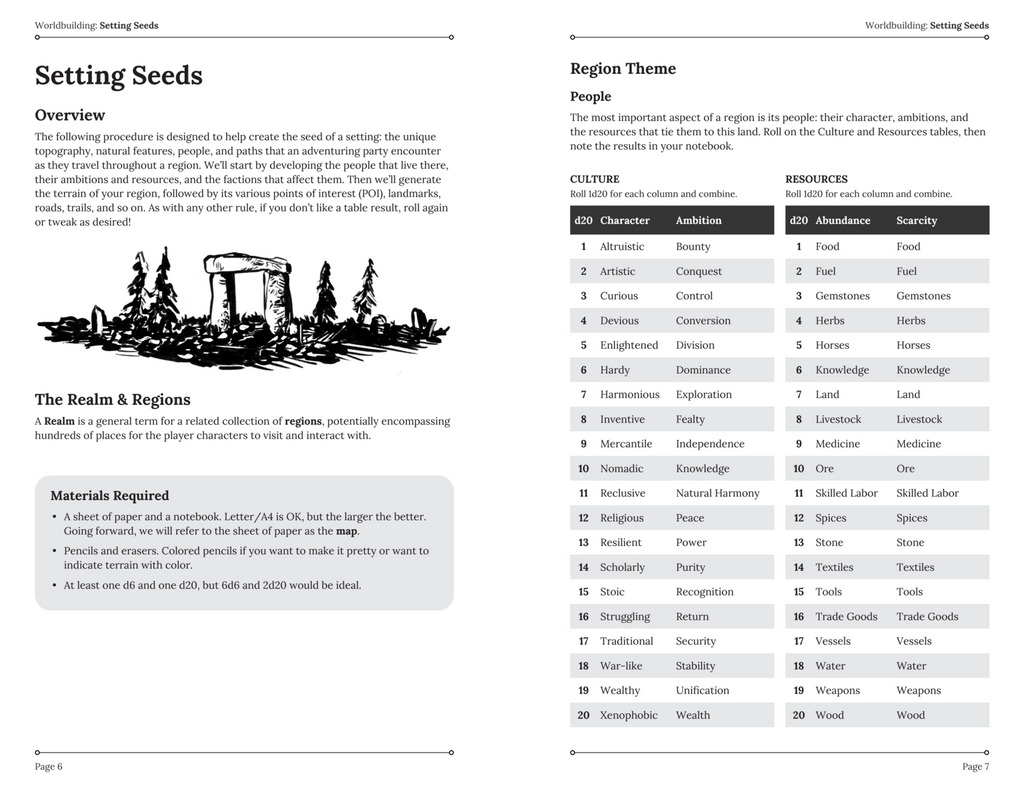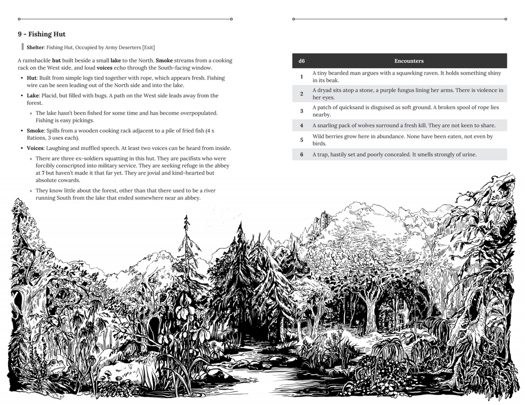 The Warden’s Guide includes tools, tables, and advice for running Cairn, with procedures to generate content that fits into the Vald setting or any fantasy world of your imagining. The following chapters offer resources and detailed instructions for creating immersive adventures, with an emphasis on dynamic gameplay and rich worldbuilding. It is our hope that with these pages anyone can craft unique, challenging experiences that engage and captivate players.