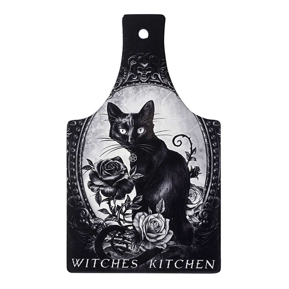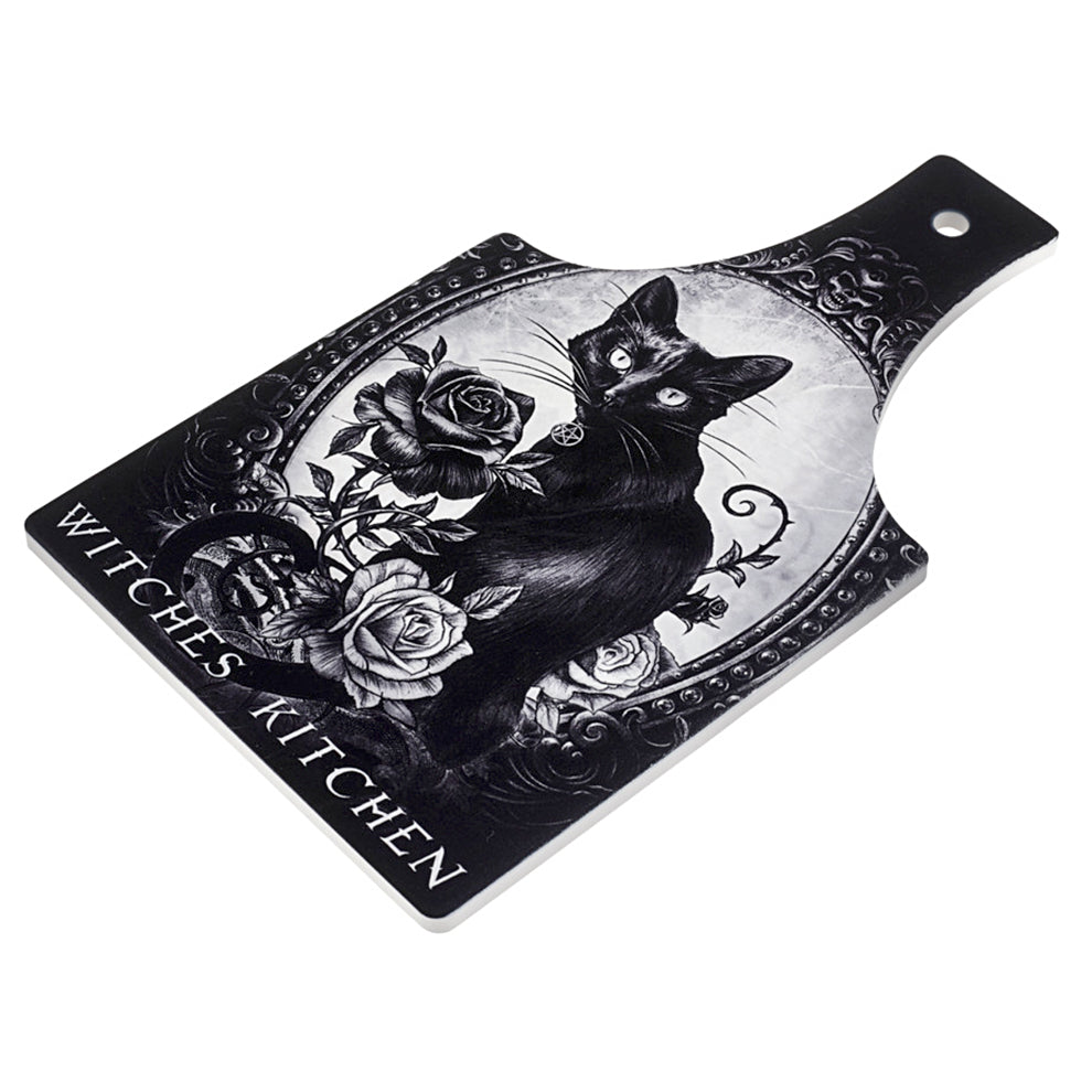 Darkly beautiful Alchemy black cat artwork is presented on this unique 'Witch's Kitchen' chopping board/serving trivet.