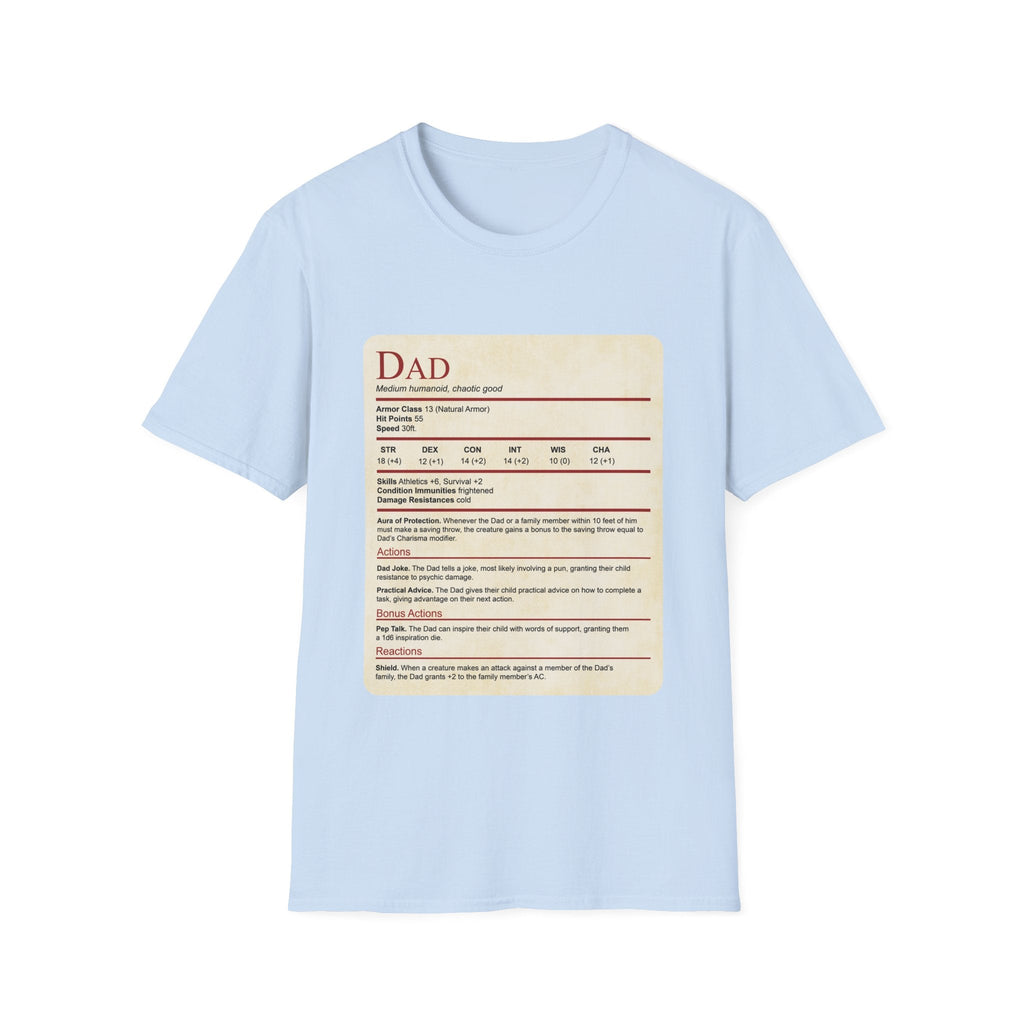 Fathers will love this dnd dad shirt designed for Dungeons & Dragons loving dads: the DnD Dad Shirt! Featuring a funny stat block for the "dad" creature, it makes for the perfect Father's Day or birthday gift for the D&D loving dad in your life. So show your appreciation for all the hard work and love that dads put into their families with our fun and functional "Dad Stat Block" t-shirt!