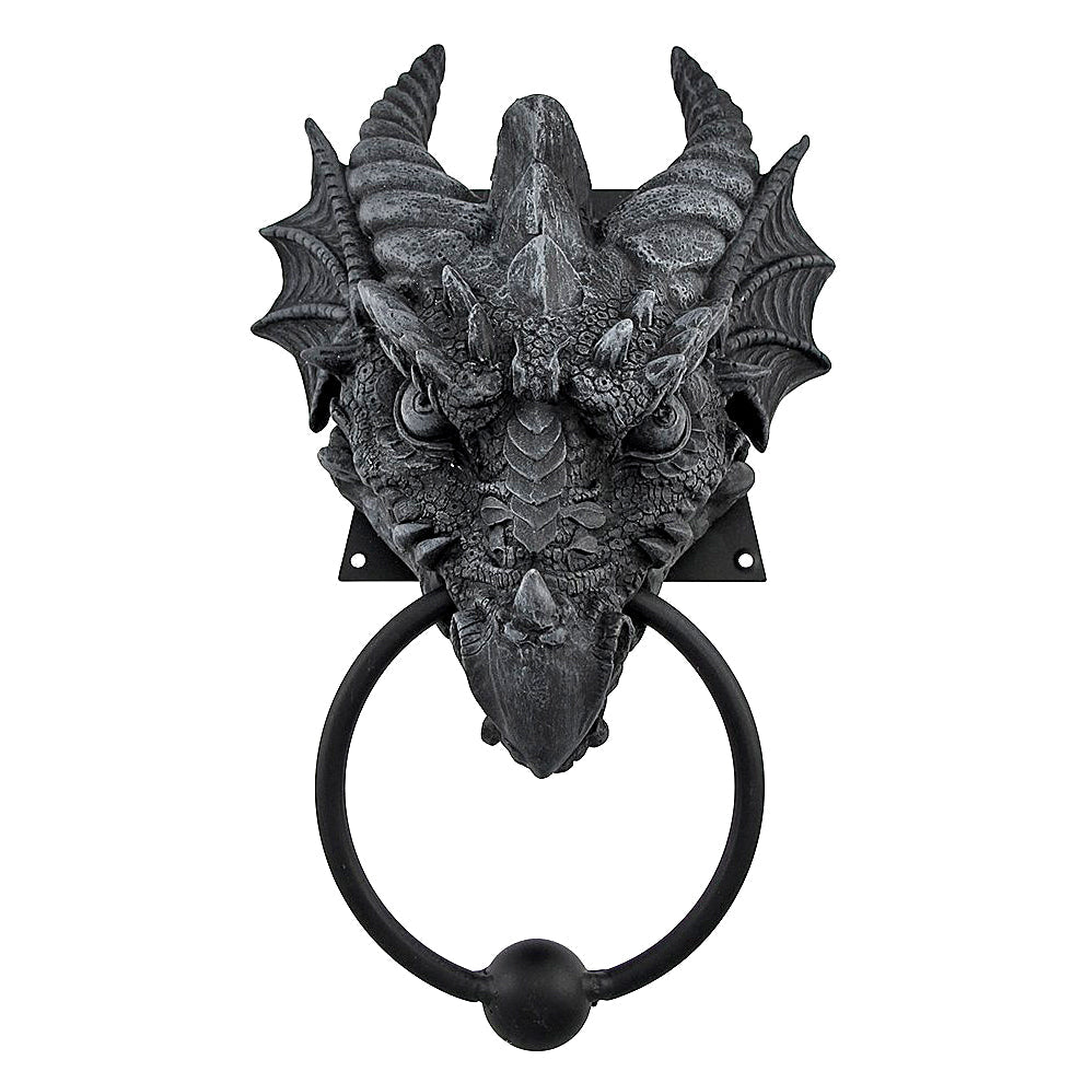 A beautiful cold cast resin, hand painted dragon's head door knocker with metal knocking ring and knob. The mystical dragon is a serpent-like, legendary creature that appears in countless folklore in many cultures around the world. Most often they are represented as large creatures having large wings, four legs (and often walk on their hind legs) horns and are capable of breathing fire. The earliest dragons resemble giant snakes. These dragons are first portrayed in the mythologies of the ancient Near East and appear in ancient Mesopotamian art and literature. The Dragon Head Door Knocker is made of cast resin and is hand painted. The dragon head is attached to a metal piece where there are four holes to make the attachment to your door, and a metal ring. Approximate Size: 10” x 5 1/2 ” x 3”. Another great use for these are bathroom towel holders!