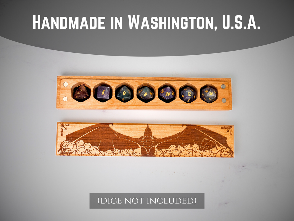The Council of 7 design perfectly accommodates a full set of RPG dice (d4, d6, d8, d10, d12, d20, and percentile), keeping them organized and protected like precious gems in a dragon's lair. The detailed hoard engravings showcase treasure imagery that resonates with dragon enthusiasts, rogue characters, and players who love collecting dice. Crafted from quality wood with meticulous attention to detail, this vault combines practical functionality with inspiring treasure-hunting artistry.