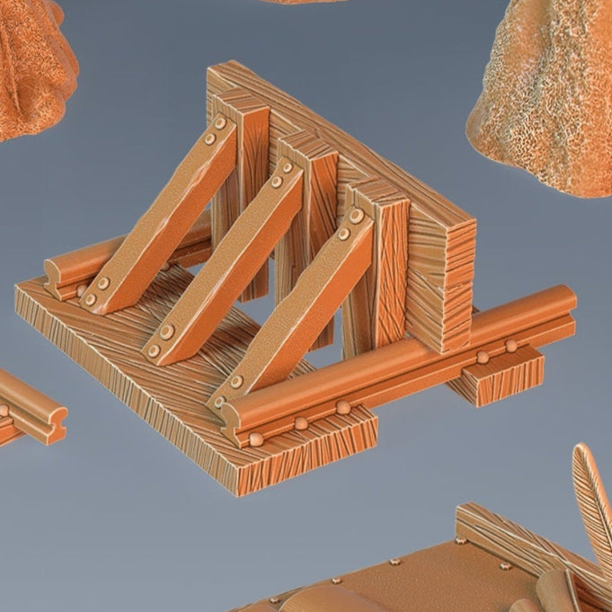 Complete your mine-themed tabletop adventure with this scatter set of dwarf carts and tracks. Includes curved and straight rails, loaded and empty ore carts, barrel stands, work tables, and terrain rocks—ideal for D&D, Pathfinder, or any gritty fantasy TTRPG mine setting.