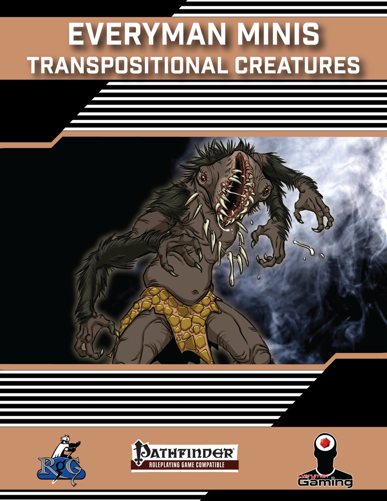 This installment of Everyman Minis includes: 1,000 words introducing an all-new simple template for the Pathfinder RPG, the transpositional creature! Representing a creature that’s become unhinged from its native plane, a transpositional creature is capable of teleporting between planes and between locations on those planes. When a transpositional creature moves between planes, it tears a hole in the fabric of reality and can drag its victims back through this gap, trapping them permanently. In addition to this grisly new template, a sample CR 11 transpositional gug is provided, as is a new animal companion archetype that allows players to spot several of the tools and mechanics associated with this archetype.