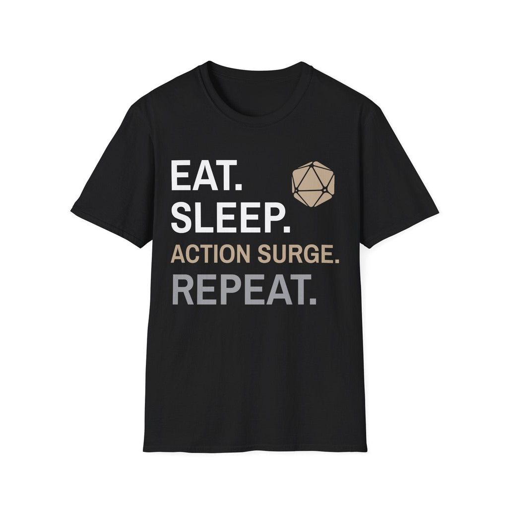 Step into the arena with our 'Eat, Sleep, Action Surge, Repeat' T-Shirt, designed for the relentless fighters of Dungeons & Dragons. This tee honors the unyielding spirit and tactical prowess of the Fighter class, making it a must-have for any combat enthusiast.