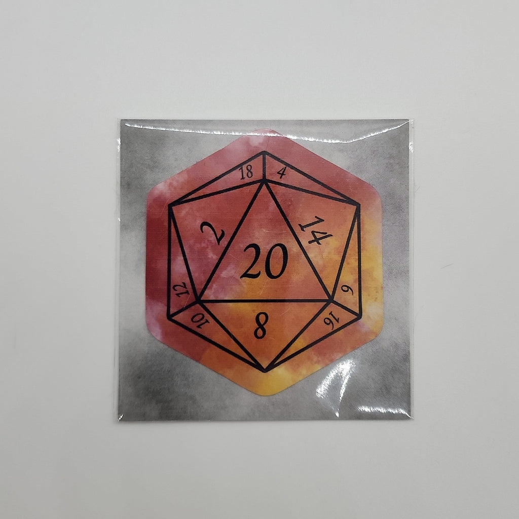 The Fireball sticker is a 2.5" hexagon D20 with a firey watercolor background.