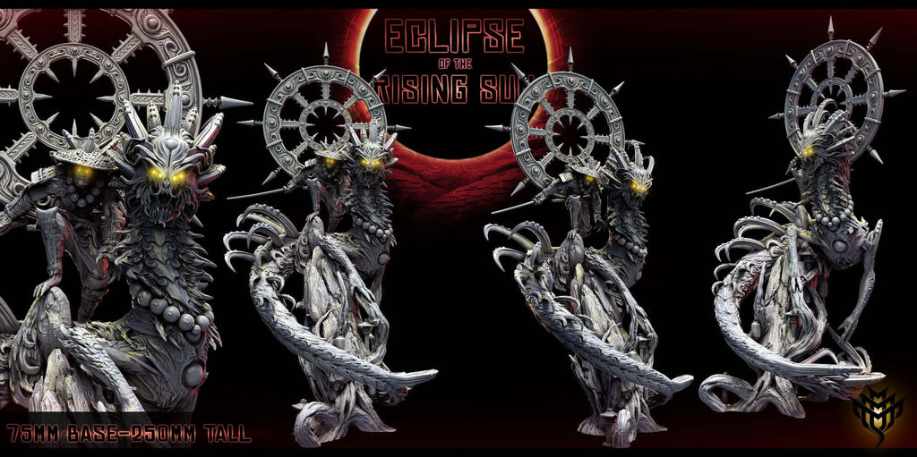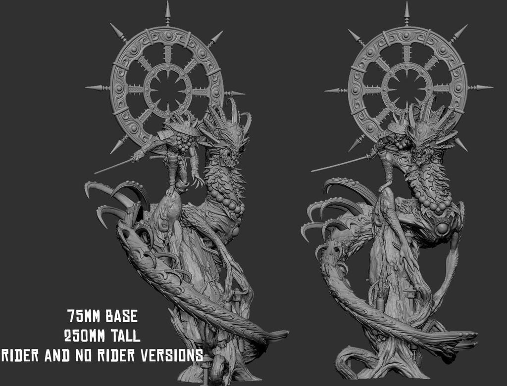 This clever mimic, disguised as a dragon with four eyes, beads around its neck, and a sun-like wheel on its upper back, has a body that transitions into a centipede's lower half. A rider perched on its shoulder completes the illusion. Ideal for D&D, Pathfinder, or Warhammer games!