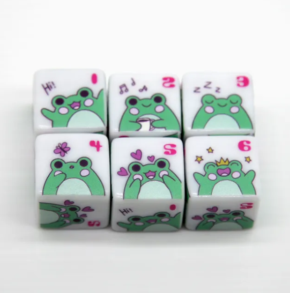 - Mood Variations: Enjoy the playful variety with each side of the dice showcasing the frog in different scenarios—whether it's catching z's, jumping with joy, or enjoying a relaxing coffee break.