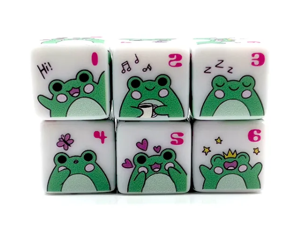 Leap into your next game night with the delightful Frog Dice! These charming printed d6 dice feature an adorable green frog captured in three different moods: sleeping soundly, bubbling with excitement, and savoring a cup of coffee. Sold individually, each die offers a unique blend of whimsy and function, perfect for adding a touch of fun to any dice game.
