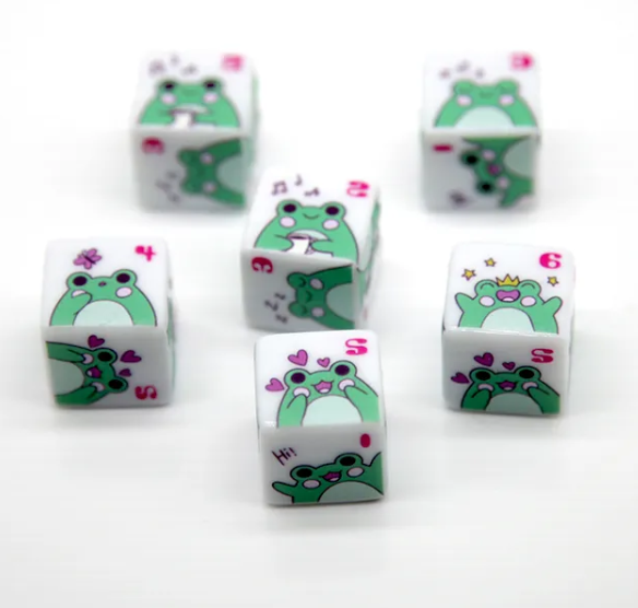 - Vibrant Design: Each die is adorned with a cute green frog in various states of activity, set against a crisp white background that makes the vivid pink numbers pop for easy readability.