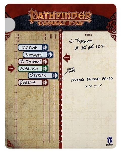 Never miss a turn with the Pathfinder Combat Pad initiative tracker. Usable with any roleplaying game, it is a double-sided wet- and dry-erasable board with a steel core, so the included magnets stick right to it! It is portable-about the size of a sheet of paper-so you can take it anywhere you're gaming.