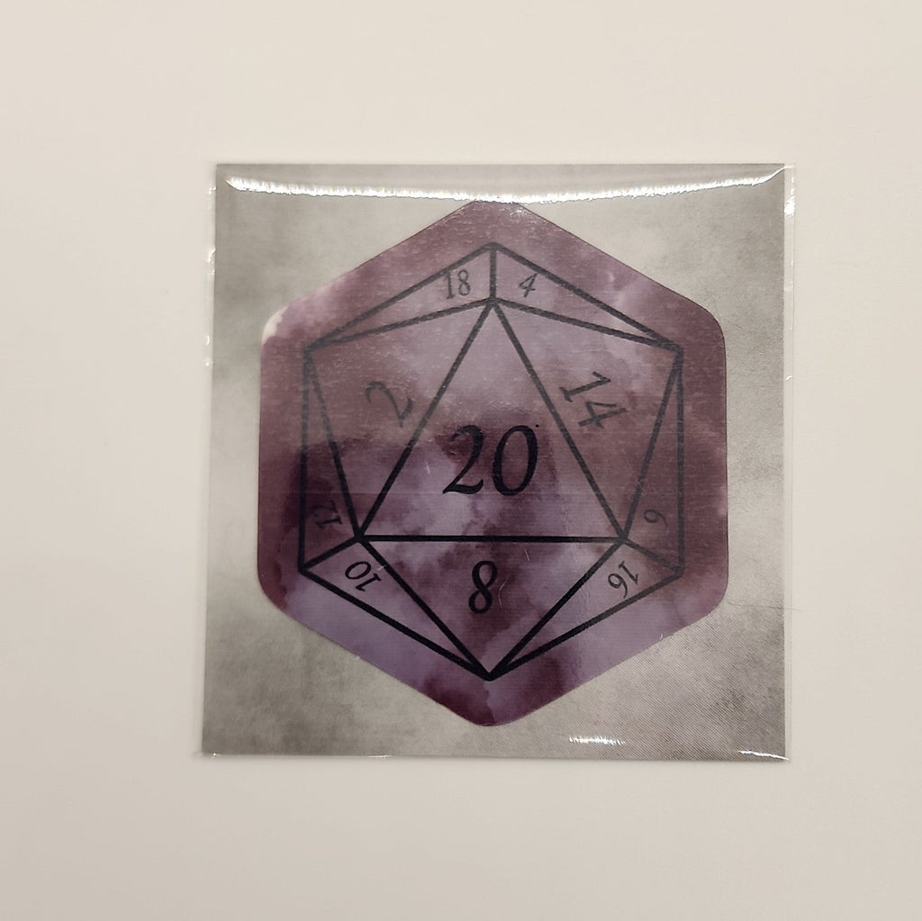 The Immolation sticker is a 2.5" hexagon D20 with a deep maroon and grey watercolor background.