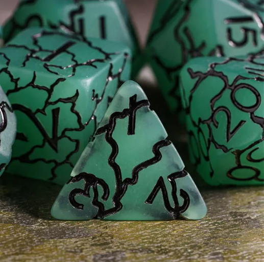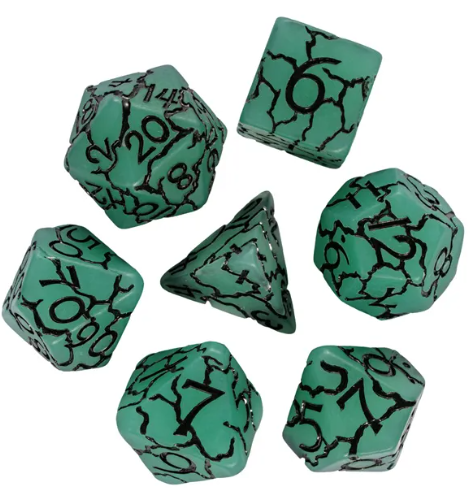 Experience the mystical allure of the "Jade Crackle Nexus" dice set, a captivating collection designed for the discerning role-player. Each die in this 7-piece set features a mesmerizing green hue with a unique crackle effect, symbolizing the raw energy of ancient magic. The numbers are meticulously inked in bold black, offering a striking contrast that ensures legibility and adds to their enchanting appearance. Perfect for RPG adventures and collectors alike, the "Jade Crackle Nexus" set invites you to unlock new realms of imagination with every roll.