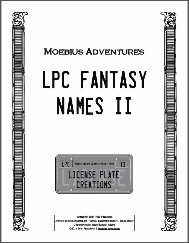 LPC Fantasy Names II takes the second 100 names from my travels and offers four new transformations to apply to make each name even more unique. Use the product as a simple list or you can apply a transformation and make the list grow exponentially. Or mix and match between products to make things even more interesting!