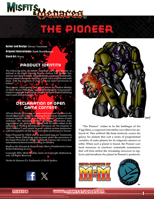This Misfits & Menaces release presents The Pioneer, a galaxy-traveling, alien robot that destroys and then rebuilds worlds to the needs of unknown masters, the Y’igg’ildan. Wherever this devastating machine goes, entire civilizations, species, and worlds die.