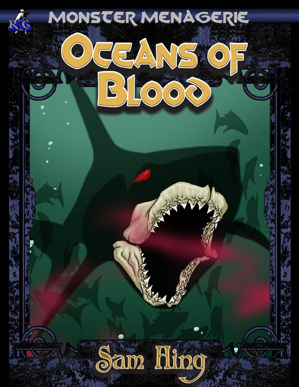 Welcome to Oceans of Blood, the sixth in our line of monster books called Monster Menagerie. Each volume in this line presents a small set of monsters tied to a single theme, but spread over a range of CRs. For Oceans of Blood, the theme is threats of the sea, with an emphasis on monsters that bite, tear, and rend. Author Sam Hing has created aquatic adversaries ranging from the mindless CR 1 harpoon weed and razor shoal to the incomprehensible CR 14 anemone behemoth, with enough surprises in-between to spice up seaborne adventures of any level.