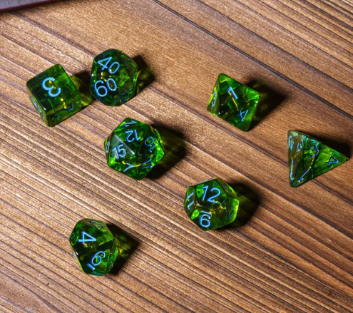 Journey into a realm where fantasy meets reality with our Mystic Archer's Enchantment Dice set. Crafted with exquisite precision, each die boasts a unique translucent green hue, reminiscent of ancient and magical forests where mythical creatures roam.