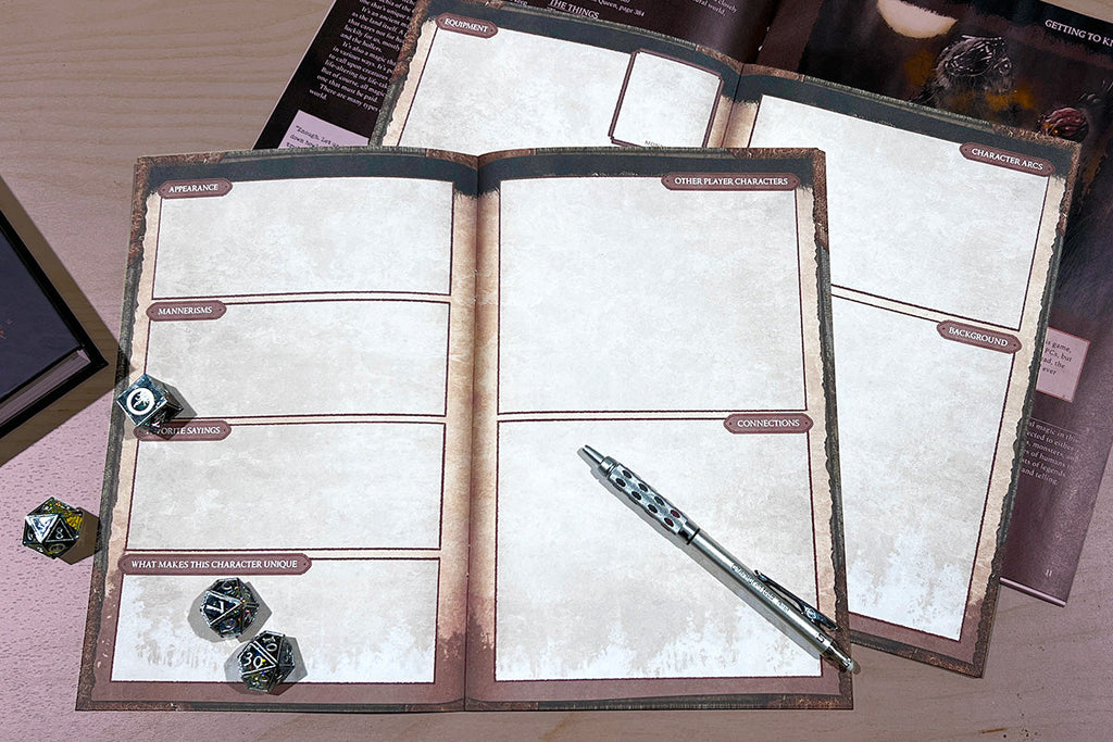 A setting rich in lore and detail evokes characters equally deep and vibrant. These 24-page character portfolios do the job of a character sheet, but also give you room for notes, sketches, and other details. Keep a campaign journal, make maps and location notes, keep track of NPCs, and flesh out your character’s backstory and relationships.