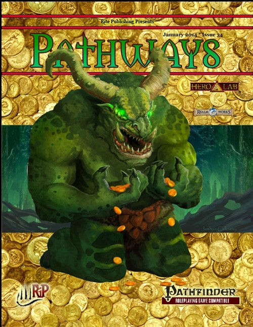 Rite Publishing brings you Pathways, a free 'zine packed with plenty of Open Gaming Content for you to take to the table. You'll find articles by Steven D. Russell (1001 Spells), Liz Winters (Lone Wolf Development), and Crieghton Broadhurst (Raging Swan Press). You will also find the top 3pp reviews by Endzeitgeist plus an interview with Greg LaRose of Amora Games.